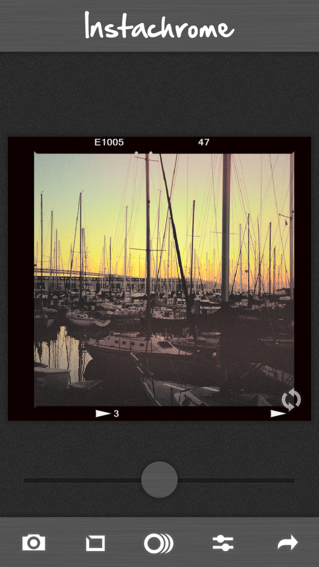 Each style offers assorted editing opportunities and previews you can adjust and view in real-time. For example, Instachrome lets you use the onscreen slider to adjust exposure, instant amount, autochrome amount, contrast, and saturation. As you move the slider, the app automatically shows you a small dynamic preview of what the composition would look like.